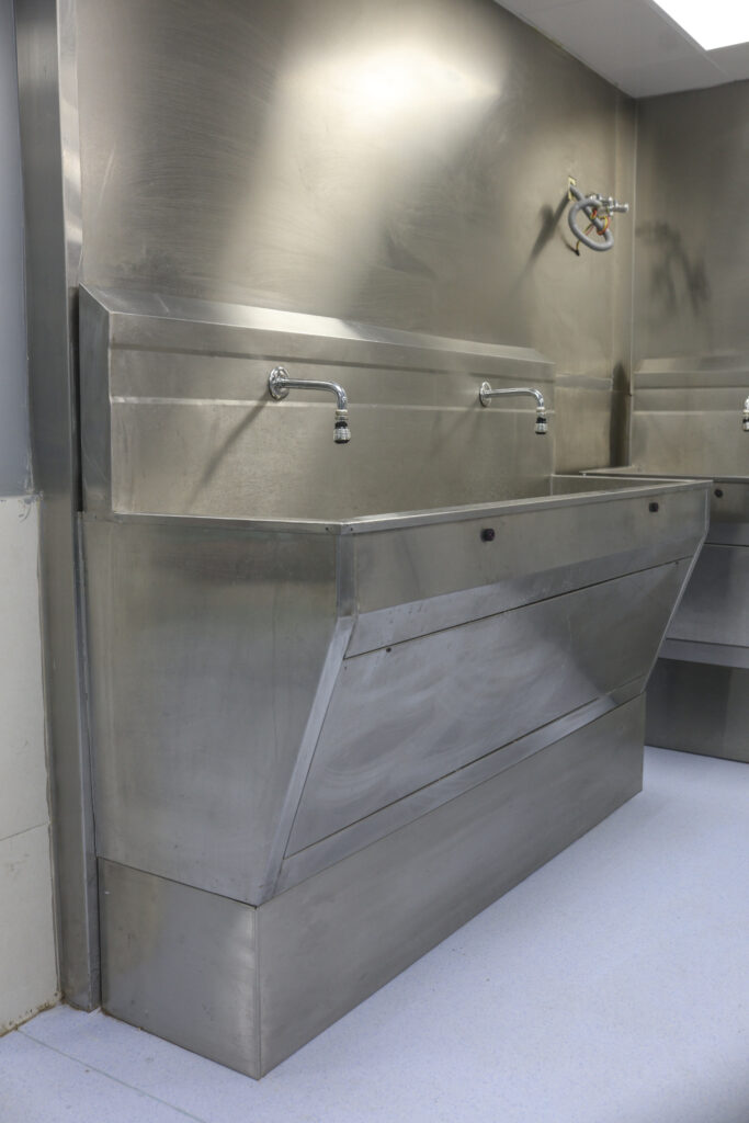 Fabricated with sensor or manual taps, splash-proof panels, and seamless construction — ideal for operation theaters and clean zones.